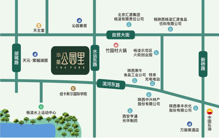 华星集团择址杨凌,立足大西安生态轴上、秦川渭水大境,依托“一带一路”重要引擎杨凌自贸区,用匠心打造城市公园封面作品——华星 · 公园里。项目雄踞“一河两岸”山水宝地,南望800里秦岭、渭河生态区,北邻全国著名自贸区,繁华与自然共生。3公里内直达汽车新站、高铁站、高速入口,半小时进入西安、宝鸡生活圈,多维交通体系畅达四方。